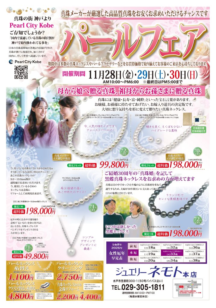 2025年11月28日(金)から30日(日)の3日間、ジュエリーネモト水戸本店店内にて【パールフェア】を開催いたします!
