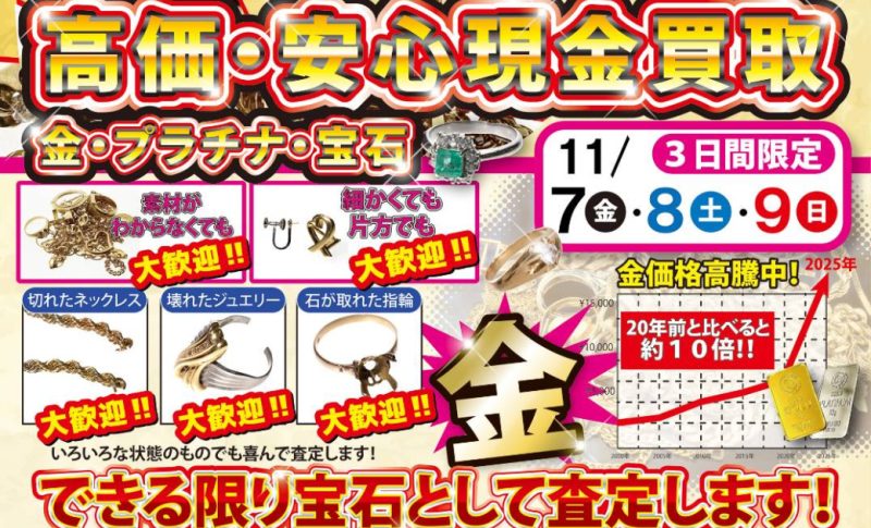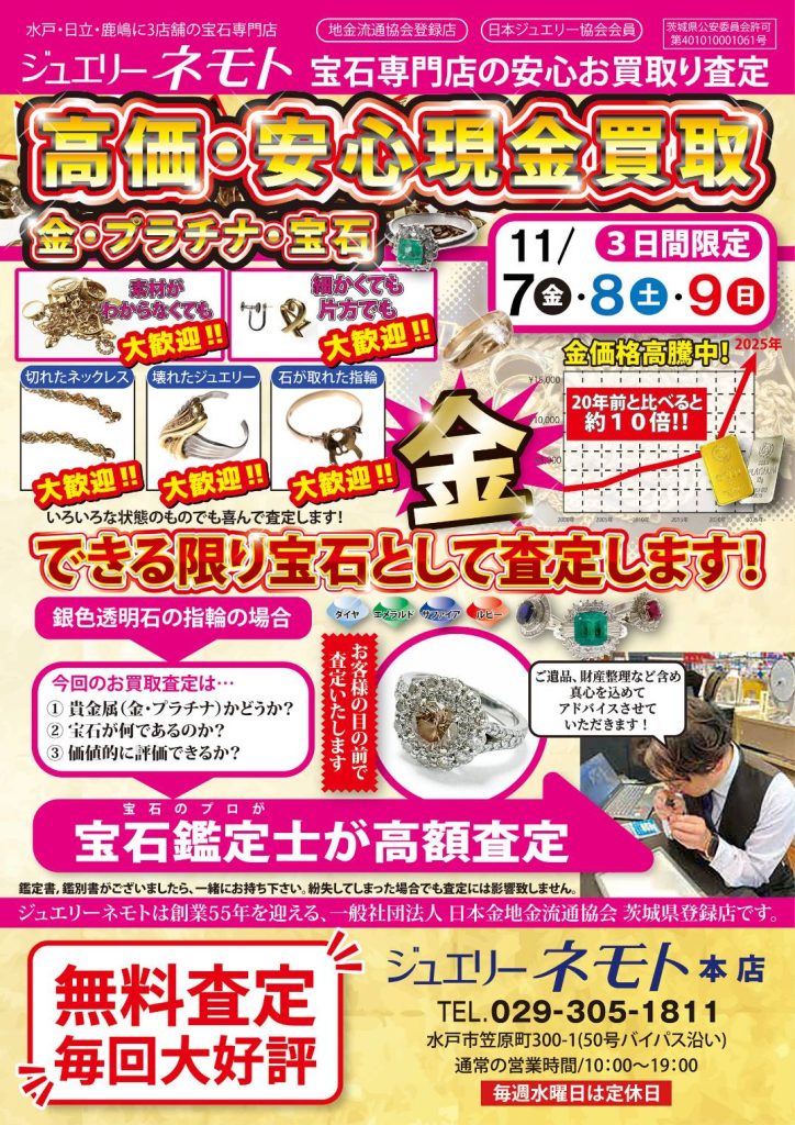 2025年11月7日(金)から9日(日)の3日間、ジュエリーネモト水戸本店店内にて【ジュエリー査定&買取】を行います。
